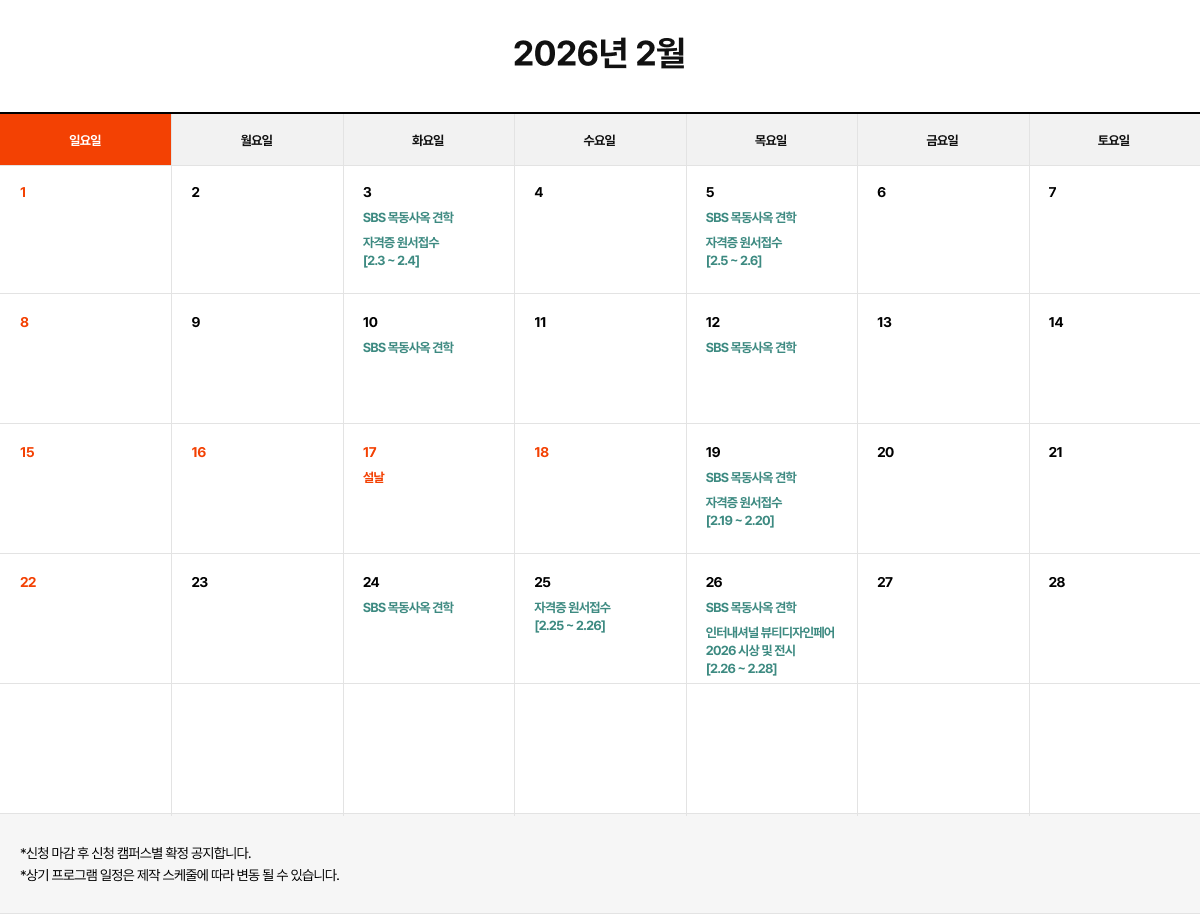 | 34 | 2026³â 2 ¿ù ¹æ¼Û±¹ ÇöÀå¼ö¾÷ ÇÁ·Î±×·¥ÀÏÁ¤ | º»»ç | 2026-02-23 |